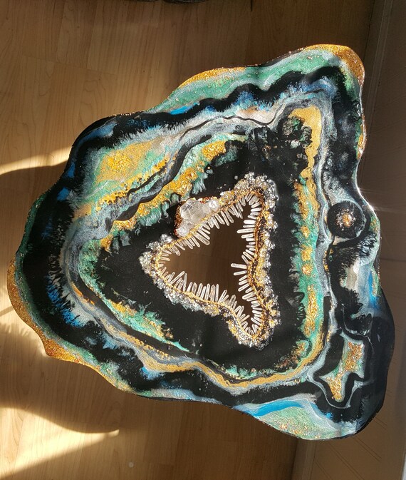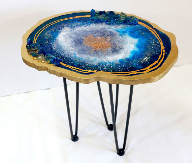 Geode resin epoxy middle table, agate coffee table, epoxy natural stone coffee table, furniture, amethyst, living room table, table, decor. 4.5 out of 5 stars. 4.5 out of 5 stars. Coffee end table, geode epoxy table in blue with black metal legs , furniture loft style of epoxy resin, art decor, decor home, table. I use crushed glass in light blue, dark blue and gold.